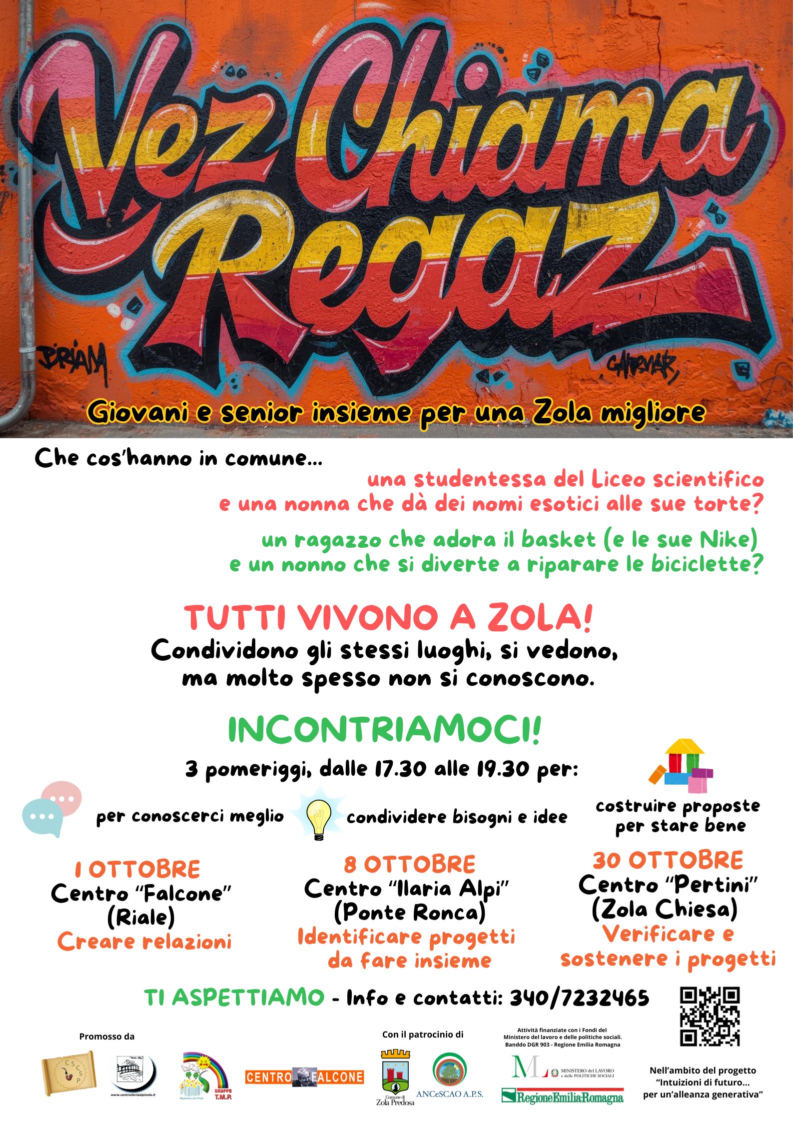 A Zola Predosa torna la voglia di incontro e di comunità con “VEZ CHIAMA REGAZ: Giovani e senior per una Zola migliore”, un’iniziativa suddivisa in tre apuntamenti che invita ragazze, ragazzi, nonne e nonni a mettersi in dialogo, scambiarsi esperienze e immaginare insieme progetti per una città più unita e accogliente.